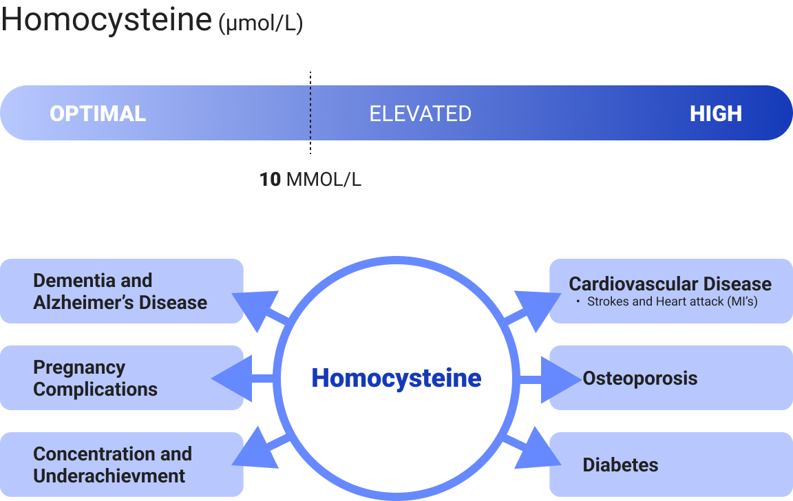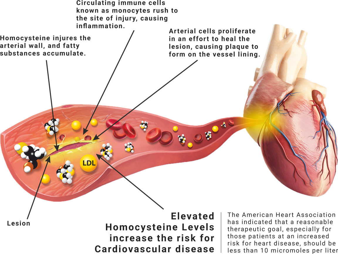 HOMOCYSTEINE levels that are too high increase the risk of heart disease, stroke, and dementia.