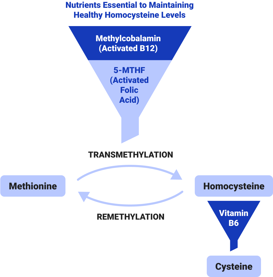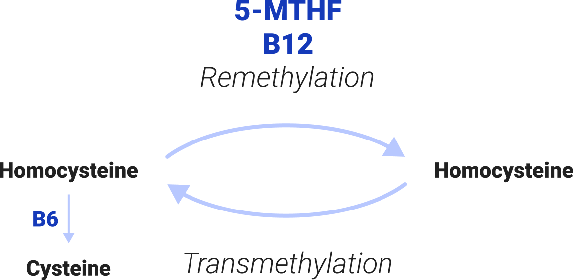 We need to ensure adequate intake of 5-MTHF, B6, and B12 to effectively convert excess Homocysteine into Methionine and Cysteine, which the body needs.